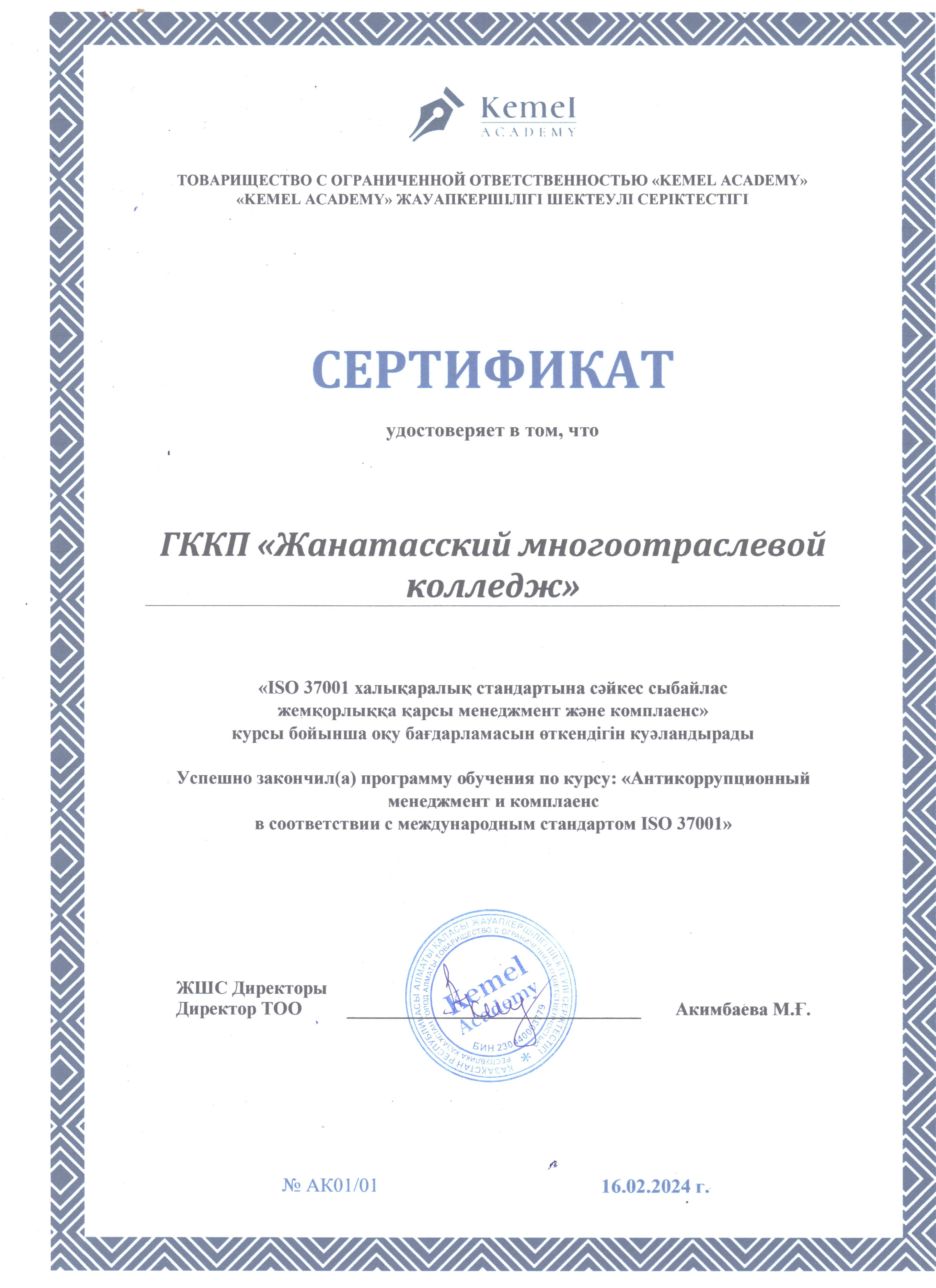 2024 жылғы 13 наурыз айында Жамбыл облысы білім басқармасының «Жаңатас көпсалалы колледжі» мемлекеттік коммуналдық қазыналық кәсіпорнында семинар өткізілді. Іс – шара мақсаты: азаматтықты, қазақстандық патриотизмді, өз Отанының тағдыры үшін мемлекет заңдарын сақтау жауапкершілігін қалыптастыру.
