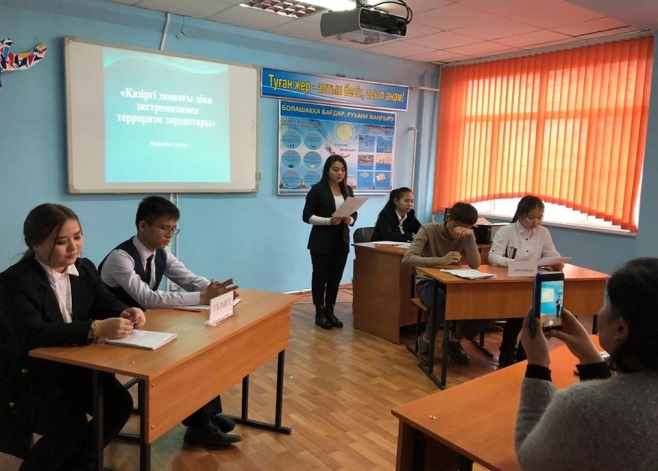 Мақсат Маратұлы «Дін» сөзінің мағынасын аша келе әлемдік проблемаға айналған діни экстремизм мен терроризмнің зардаптарына тоқталып, студенттермен дін туралы сұхбаттасты . Сондайақ пікірсайыс барысында жиі пайдаланылған терминдерге түсінік беріп өтті. «Экстремизм» — бұл қоғамдық нормаларға түбегейлі қайшы, шектен шығатын, саясатты, дінді бұрмалауға негізделген, саяси, экономикалық, әлеуметтік тұрғыдан саясаттың тұрақсыздығынан, экономикалық салдардан туындайтын идеологиялық құбылыс екенін айтып , студенттерді ел бірлігі мен ынтымағына өз үлесін қоса білетін зайырлы қоғамның беделді азаматы болуға шақырды. Пікірсайыс соңында өз позициясын үздік қорғай білген фракцияларға директордың тәрбие ісі жөніндегі орынбасары А.Естемесова мақтау грамоталарын табыстады.