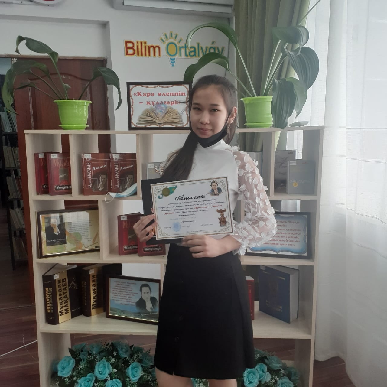 Сарысу аудандық кітапханасының ұйымдастыруымен өткізілген Тәуелсіздіктің 30 жылдығы аясында М.Мақатаевтың 90 жылдығына арналған "Жыр дүлдүлі - Мұқағали Мақатаев " атты Мұқағали оқуына қатысқан 3 курс 03-18 тобының студенті Мырзағараева Балнұр алғыс хатпен мараппатталып Маралтай Райымбекұлының өлеңдер жинағын сыйлыққа алды.