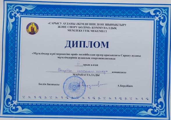 Сарысу ауданы әкімдігінің дене шынықтыру және спорт бөлімінің ұйымдастыруымен "Мұғалімдер мерекесіне орай" волейболдан ерлер арасында аудандық мұғалімдер арасында спартакиада өтті. Жарысқа колледждің ер мұғалімдері қатысып "волейболдан" 2орын, М. Ажмаханов "дойбы" 1орын, "Дартстан" 4орын Б. Маймақ, жалпы командалық есепте 4орын иеленді. Құттықтаймыз!