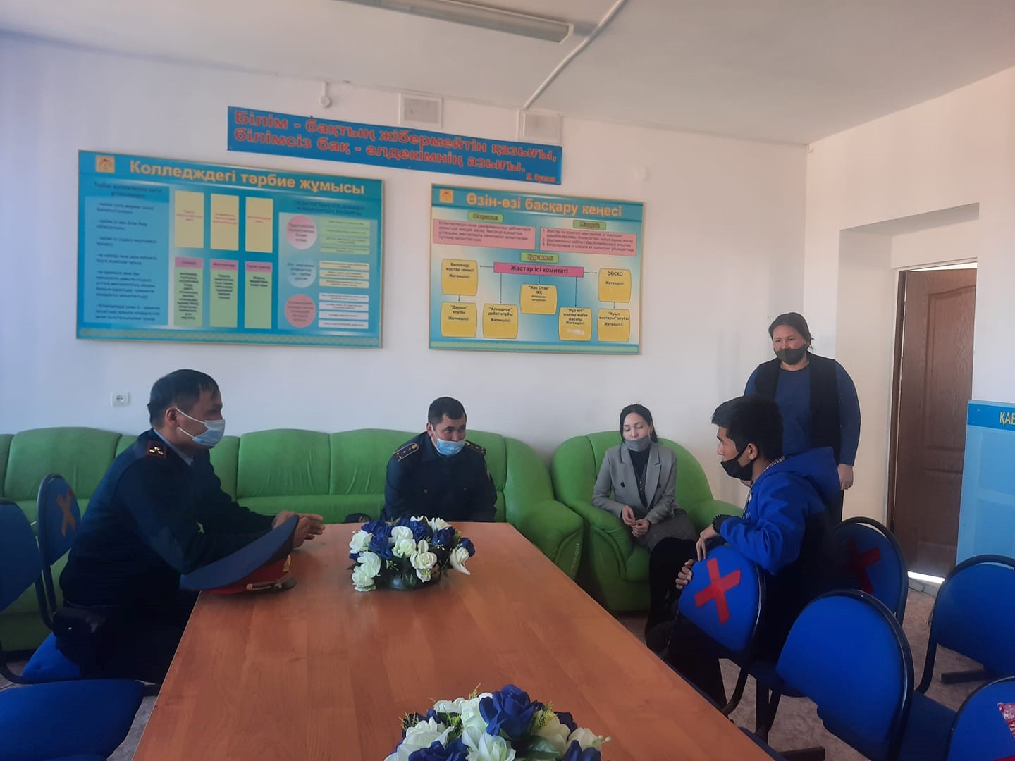 2021жылдың 16қазан күні АПБ-нің ЮПТ инспекторы Кентаев Алмат Алтайұлының, директордың тәрбие ісі жөніндегі орынбасары А.Қойлыбекованың қатысуымен "Қылмыстың өтеуі-жаза" тақырыбында түсіндіру жұмыстары жүргізілді. Кездесу барысында студент жастарға құқықтық сауаттылық, педагогикалық-психологиялық ақыл кеңестер берілді.