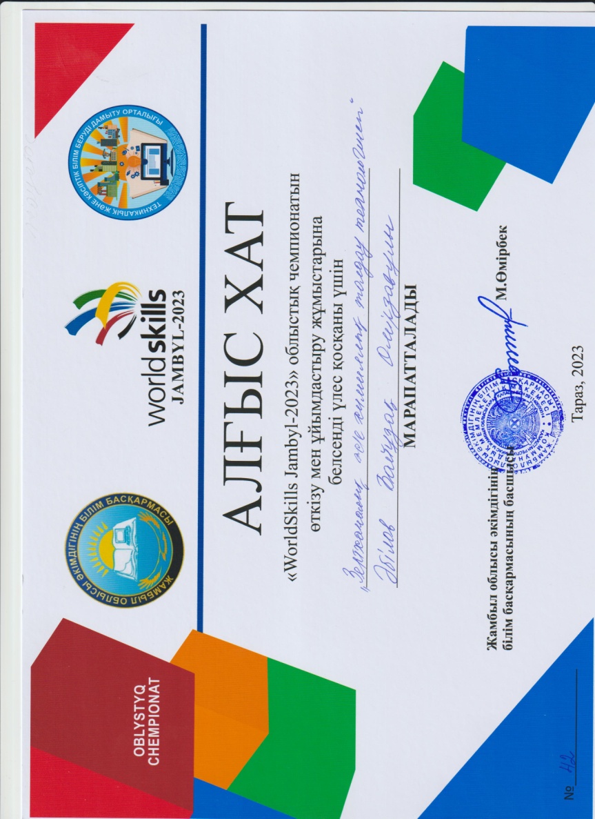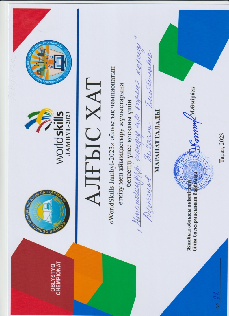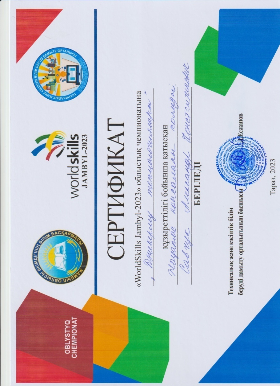 - Савчук Александр Константинович «Дәнекерлеу ісі»- құзыреттілігі бойынша, жетекшісі: Маймақ Бауыржан
