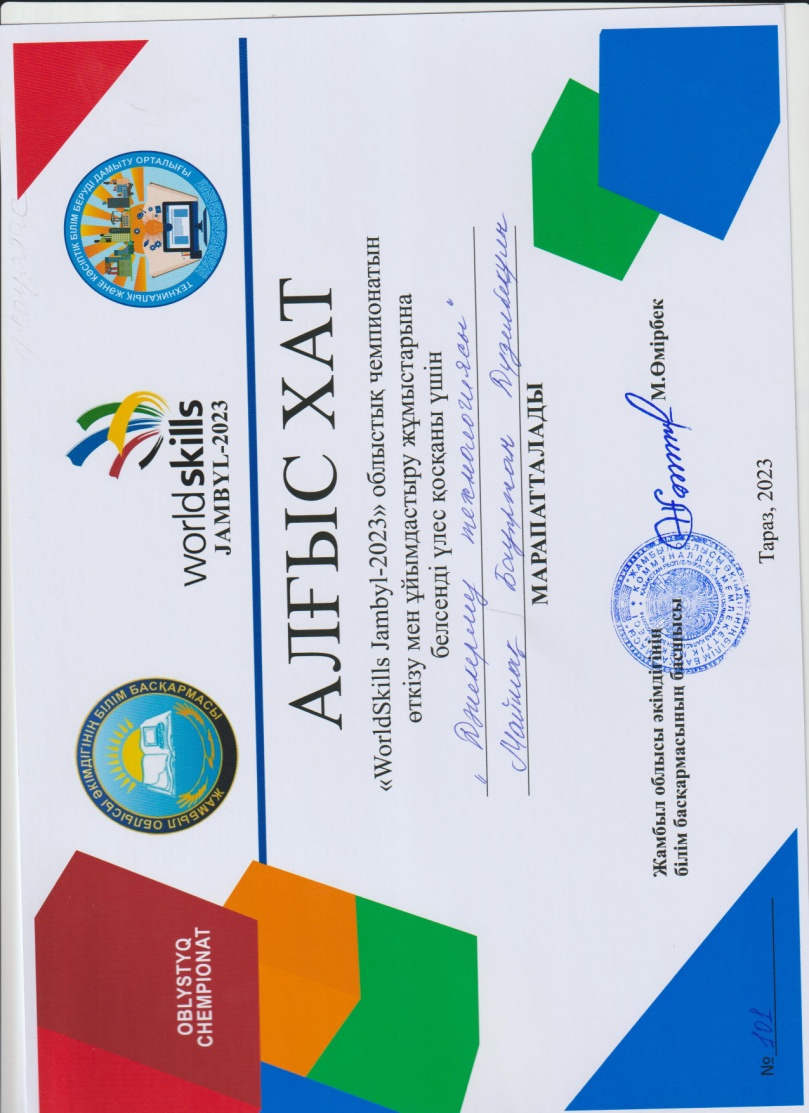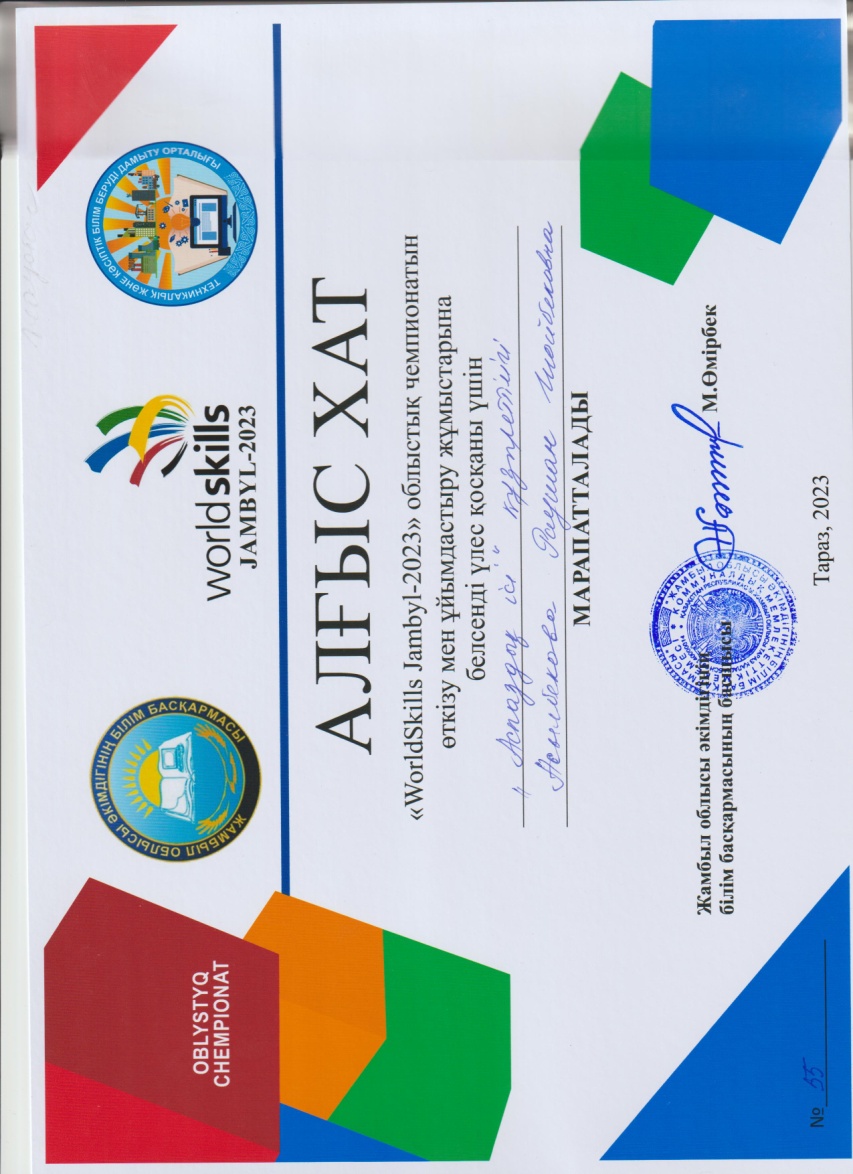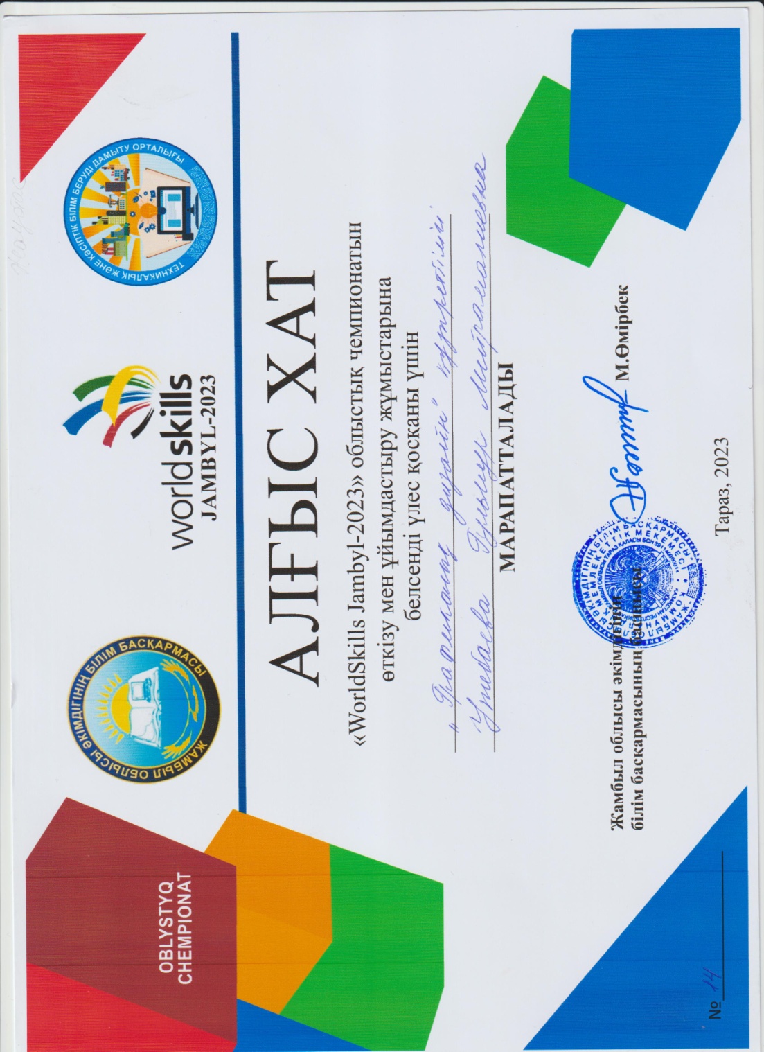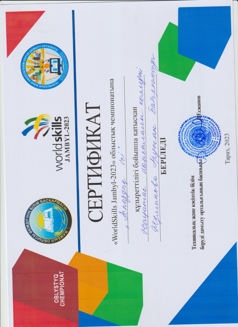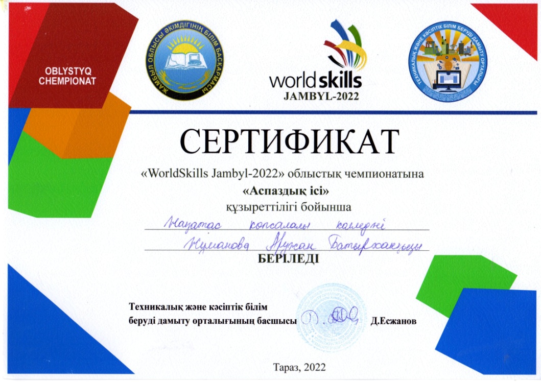 - Жұманова Аружан Батырханқызы - «Аспаздық ісі» -құзыреттілігі бойынша, жетекшісі: Асылбекова Раушан