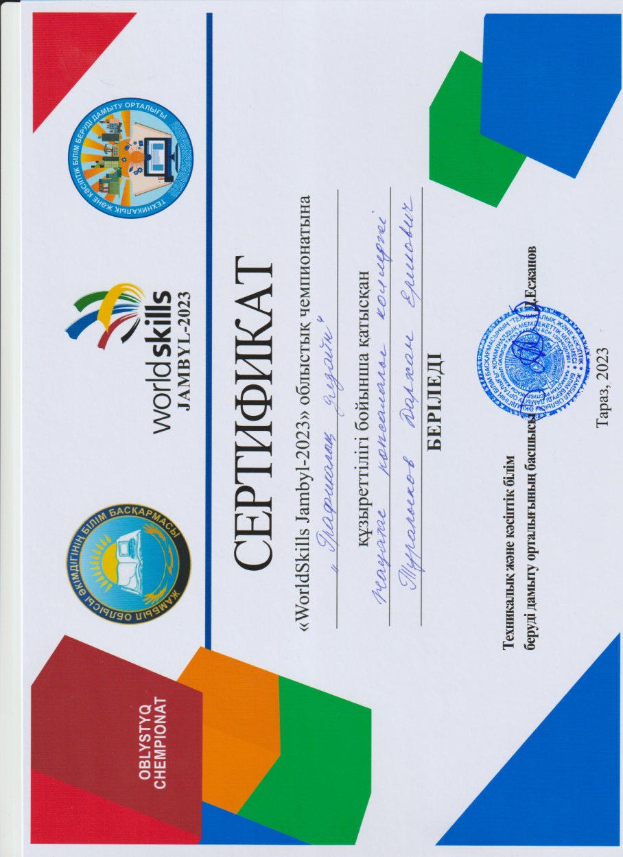 - Туралыков Дархан Ерикович - «Графикалық дизайн» - құзыреттілігі бойынша, жетекшісі Утебаева Гульнур Мейрамалиевна.